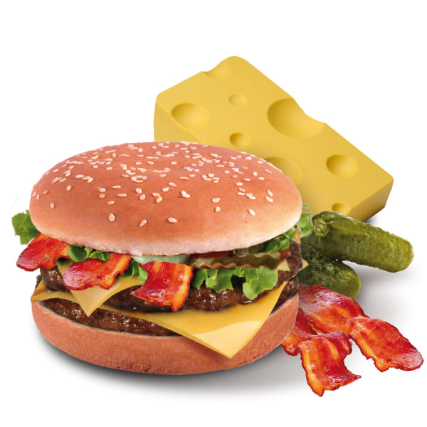 Double steak, double cheddar, bacon, salade, cornichons, sauce gruyère.
